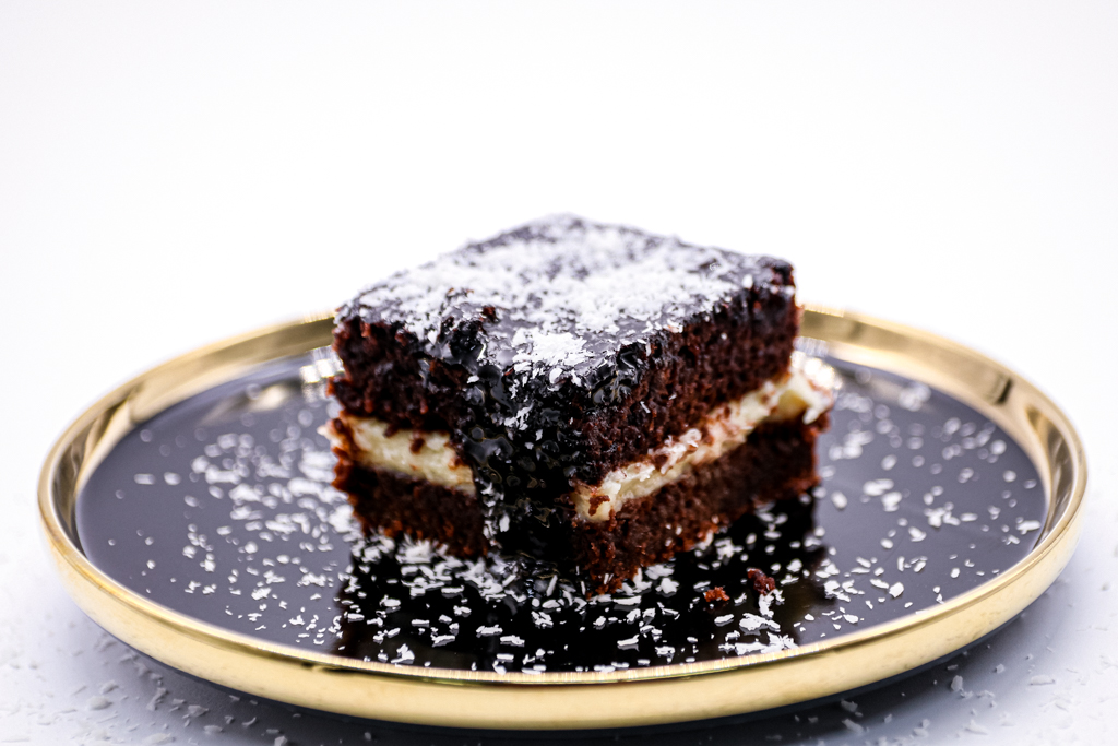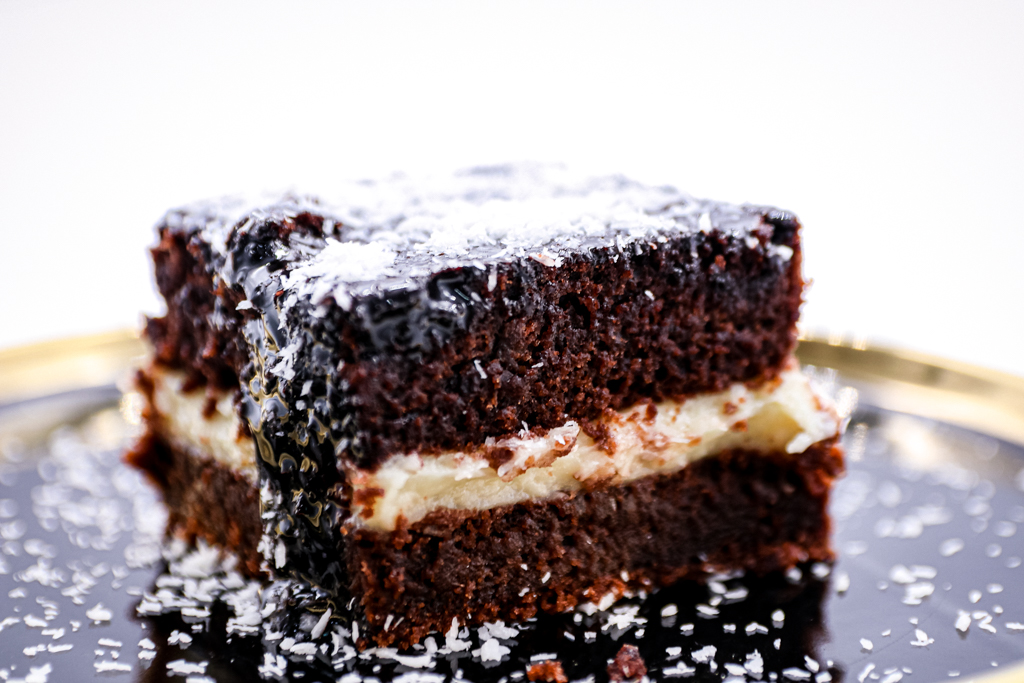 Negresă de post cu cremă de cocos, un adevărat răsfaț culinar. O prăjitură fină, densă cu un gust intens de cacao care se îmbină perfect cu textura moale și ușor umedă peste care se așterne un strat generos de cremă de cocos, parfumată, aromată, dulce și minunată.